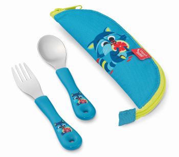 A kollekciót egy stílusos, fém kanálból és villából álló evőeszközkészlet teszi teljessé, mely egy puha szövet tokban rejlik. Kompakt méretének hála az uzsonnásdobozban is elfér.
