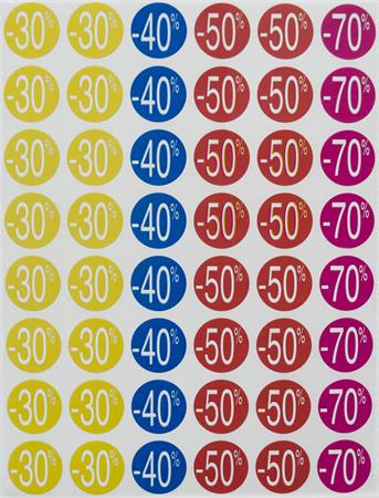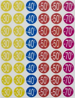 Színes, előnyomott kör címkék különböző kedvezmények jelölésére. Átlátható és figyelemfelkeltő megoldás akciókhoz!